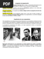 operacin para cada una de sus funciones. La segunda parte de la instruccin es el operando, que indica a la computadora donde hallar o almacenar los datos y otras instrucciones que se van a manipular; el nmero de operandos de una instruccin vara en las distintas computadoras. Lenguaje ensamblador La comunicacin en lenguaje de mquina es particular de cada procesador que se usa, y programar en este lenguaje es muy difcil y tedioso, por lo que se empez a buscar mejores medios de comunicacin con sta. A principios de la dcada de 1950, y con el fin de facilitar la labor de los programadores, se desarrollaron cdigos mnemotcnicos para las operaciones y direcciones simblicas. Uno de los primeros pasos para mejorar el proceso de preparacin de programas fue sustituir los cdigos de operacin numricos del lenguaje de mquina por smbolos alfabticos, que conforman un lenguaje mnemotcnico. Todas las computadoras actuales tienen cdigos mnemotcnicos aunque, naturalmente, los smbolos que se usan varan en las diferentes marcas y modelos. La computadora sigue utilizando el lenguaje de mquina para procesar los datos, pero los programas ensambladores traducen antes los smbolos de cdigo de operacin especificados a sus equivalentes en lenguaje de mquina. Los lenguajes ensambladores tienen ventajas sobre los lenguajes de mquina. Ahorran tiempo y requieren menos atencin a detalles . Se incurren en menos errores y los que se cometen son ms fciles de localizar. Adems, los programas en lenguaje ensamblador son ms fciles de modificar que los programas en lenguaje de mquina. Pero existen limitaciones. La codificacin en lenguaje ensamblador es todava un proceso lento. Adems, una desventaja importante de estos lenguajes es que tienen una orientacin a la mquina. Es decir, estn diseados para la marca y modelo especfico de procesador que se utiliza. En el principio de la computacin este era el lenguaje que tena que "hablar" el ser humano con la computadora y consista en insertar en un tablero miles de conexiones y alambres y encender y apagar interruptores.