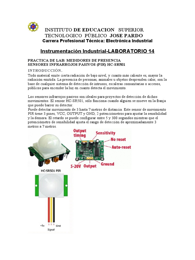 PIR tiene 3 pines, VCC, OUTPUT y GND, 2 potenciómetros para ajustar la sensibilidad