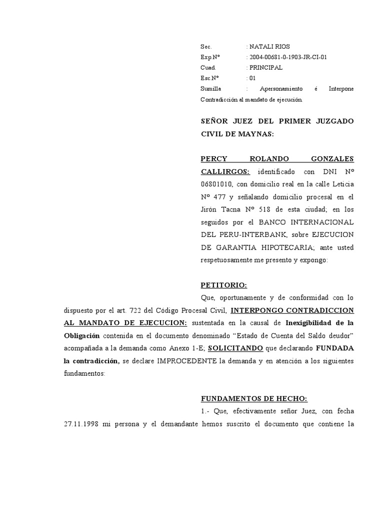 dispuesto por el art. 722 del Código Procesal Civil, INTERPONGO CONTRADICCION