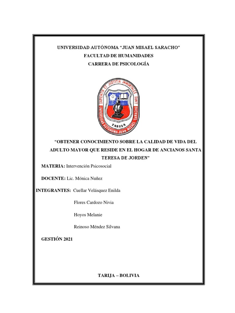 proyecto tuvo como objetivo conocer la calidad de vida en la población anciana en el asilo Santa
