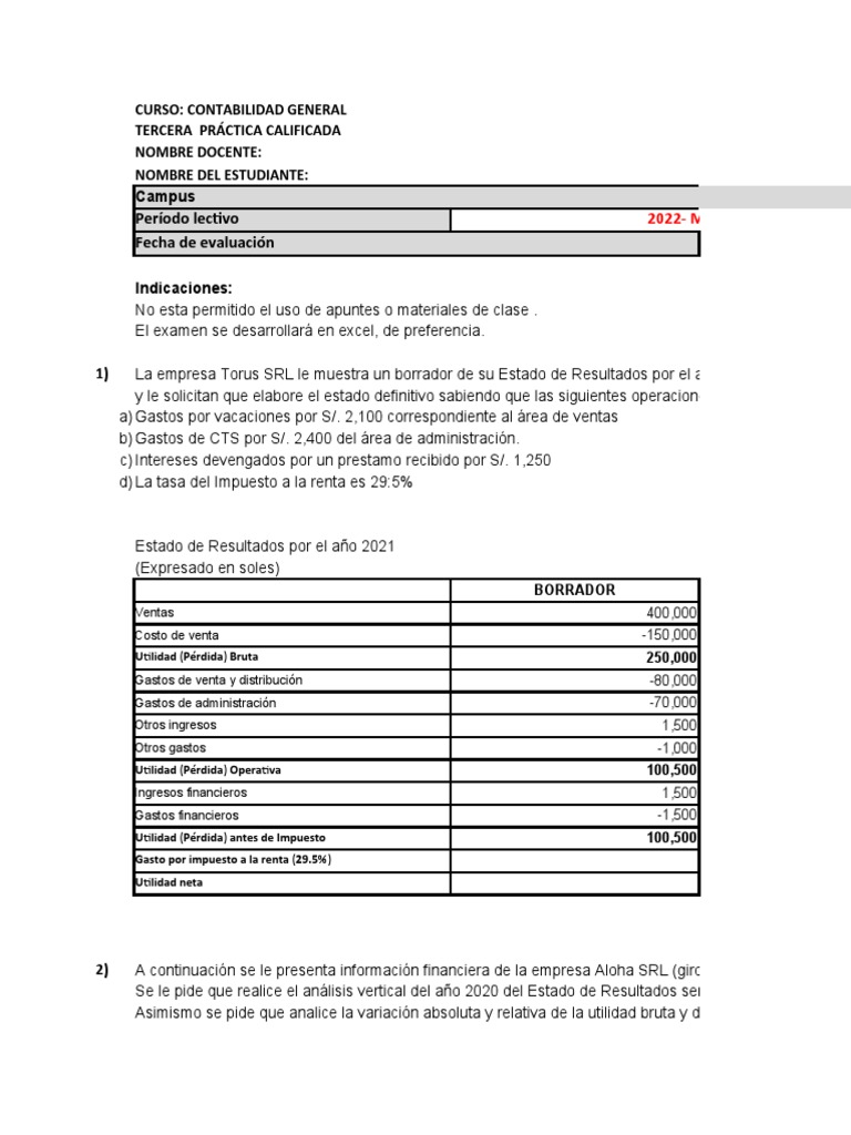 1) La empresa Torus SRL le muestra un borrador de su Estado de Resultados por el año 2021