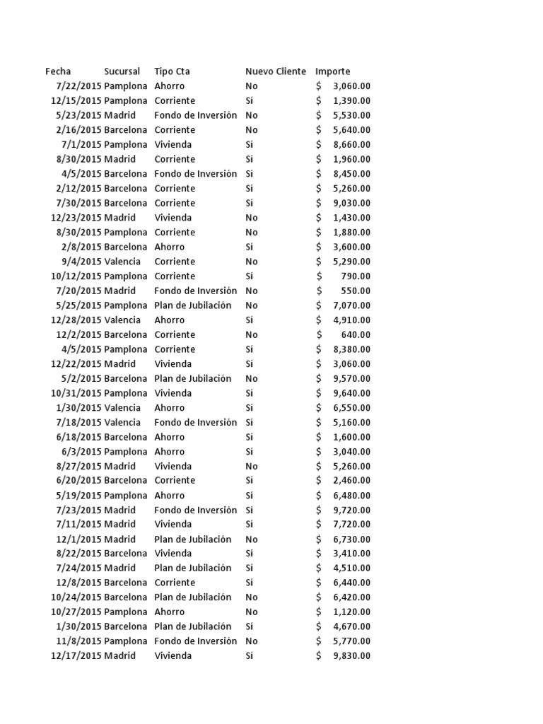 Fecha Sucursal Tipo Cta Nuevo Cliente Importe