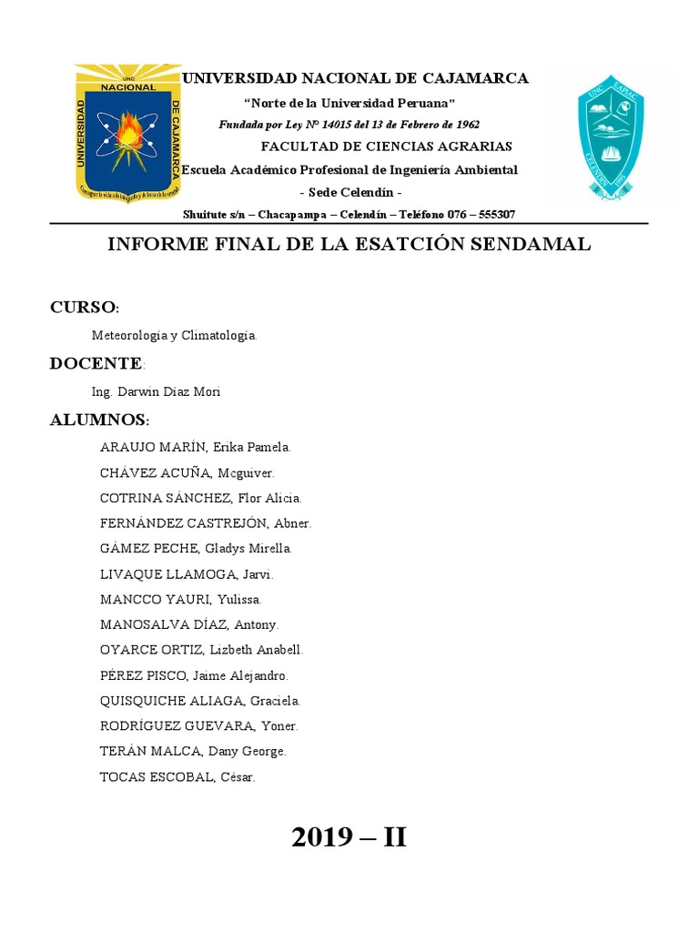 The SENDAMAL station belongs to the district of Sucre, province of Celendín, department