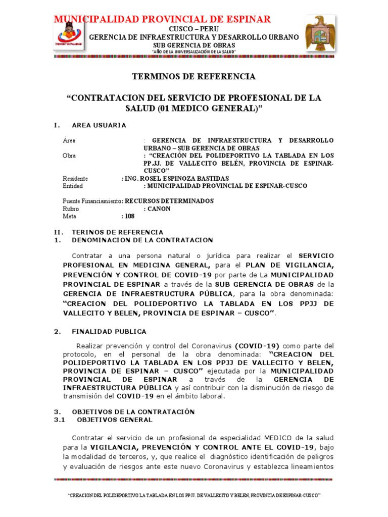 PROVINCIAL DE ESPINAR a través de la SUB GERENCIA DE OBRAS de la