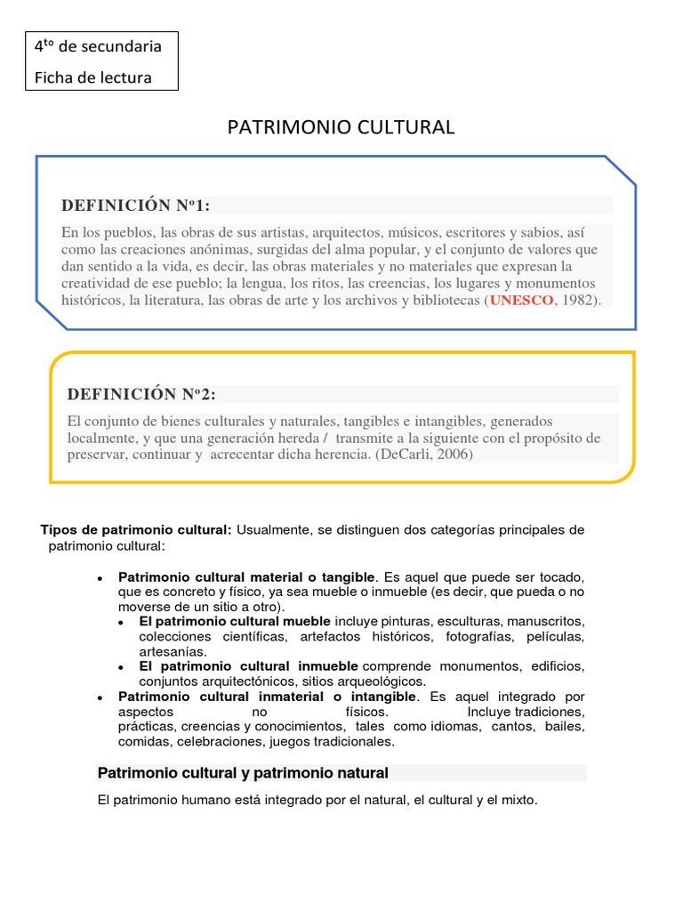 históricos, la literatura, las obras de arte y los archivos y bibliotecas (UNESCO, 1982).