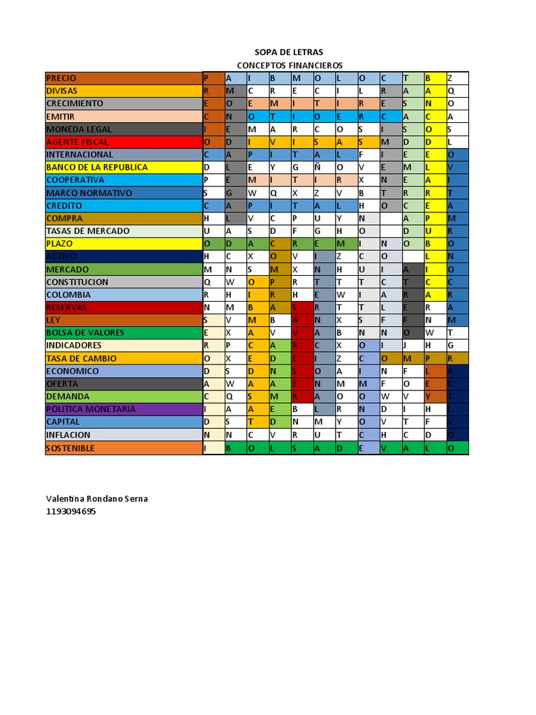 Este documento presenta una sopa de letras con conceptos financieros clave como precio, divisas, crecimiento, emitir, moneda legal, agente fiscal, internacional, banco de la república, cooperativa, marco normativo, crédito, compra, tasas de mercado, plazo, activo, mercado, constitución, Colombia, reservas, ley, bolsa de valores, indicadores, tasa de cambio, económico, oferta, demanda, política monetaria, capital, inflación y sostenible. La sopa de letras busca
