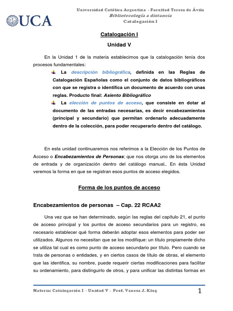 Materia: Catalogación I - Unidad V - Prof. Vanesa J. Klug 1
