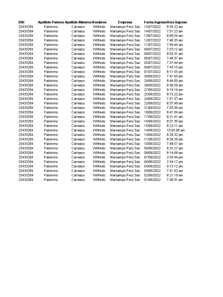 DNI Apellido Paterno Apellido Materno Nombres Empresa Fecha Ingreso Hora Ingreso
