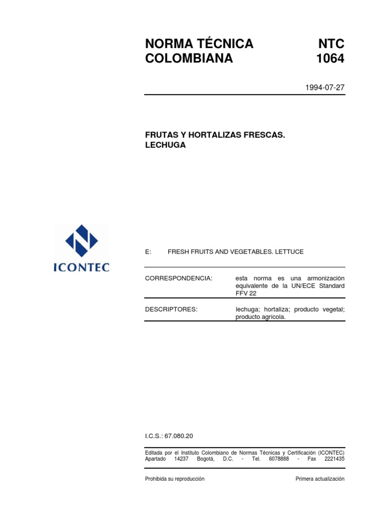 El Instituto Colombiano de Normas Tcnicas y Certificacin, ICONTEC, es el organismo nacional de normalizacin, segn el Decreto 2269 de 1993. ICONTEC es una entidad de carcter privado, sin nimo de lucro, cuya Misin es fundamental para brindar soporte y desarrollo al productor y proteccin al consumidor. Colabora con el sector gubernamental y apoya al sector privado del pas, para lograr ventajas competitivas en los mercados interno y externo. La representacin de todos los sectores involucrados en el proceso de Normalizacin Tcnica est garantizada por los Comits Tcnicos y el perodo de Consulta Pblica, este ltimo caracterizado por la participacin del pblico en general. La NTC 1064 (Primera actualizacin) fue ratificada por el Consejo Directivo de 1994-07-27. Esta norma est sujeta a ser actualizada permanentemente con el objeto de que responda en todo momento a las necesidades y exigencias actuales. A continuacin se relacionan las empresas que colaboraron en el estudio de esta norma a travs de su participacin en el Comit Tcnico 111003 Frutas, legumbres, hortalizas y tubrculos frescos. ASOCIACIN COLOMBIANA POPULAR DE INDUSTRIALES ASOCIACIN NACIONAL DE INDUSTRIALES BOLSA NACIONAL AGROPECUARIA CARULLA & CA S.A. COMPAA COLOMBIANA DE ALIMENTOS LCTEOS S.A. COMPAIA NACIONAL DE LEVADURAS LEVAPAN S.A. FEDERACN NACIONAL DE CAFETEROS FRUTAS S.A. FRUTERA COLOMBIANA S.A. INDUSTRIA LICORERA DE BOYAC INDUSTRIA NACIONAL DE CONSERVAS S.A. LA CONSTANCIA INVERSIONES CAJIAO CAICEDO & CA. S EN C. JAIBEL L TDA. LA CAMPIA S.A. LOS ALPES INDUSTRIAS ALIMENTICIAS S.A. MINISTERIO DE AGRICULTURA MINISTERIO DE SALUD PBLICA MORENOS LTDA. POLITCNICO COLOMBIANO JAIME ISAZA CADAVID SGS COLOMBIA S.A. SOCIEDAD HOTELERA CIEN INTERNACIONAL S.A. UNIVERSIDAD DE ANTIOQUIA UNIVERSIDAD NACIONAL DE COLOMBIA UNIVERSIDAD PEDAGGICA Y TECNOLGICA DE COLOMBIA