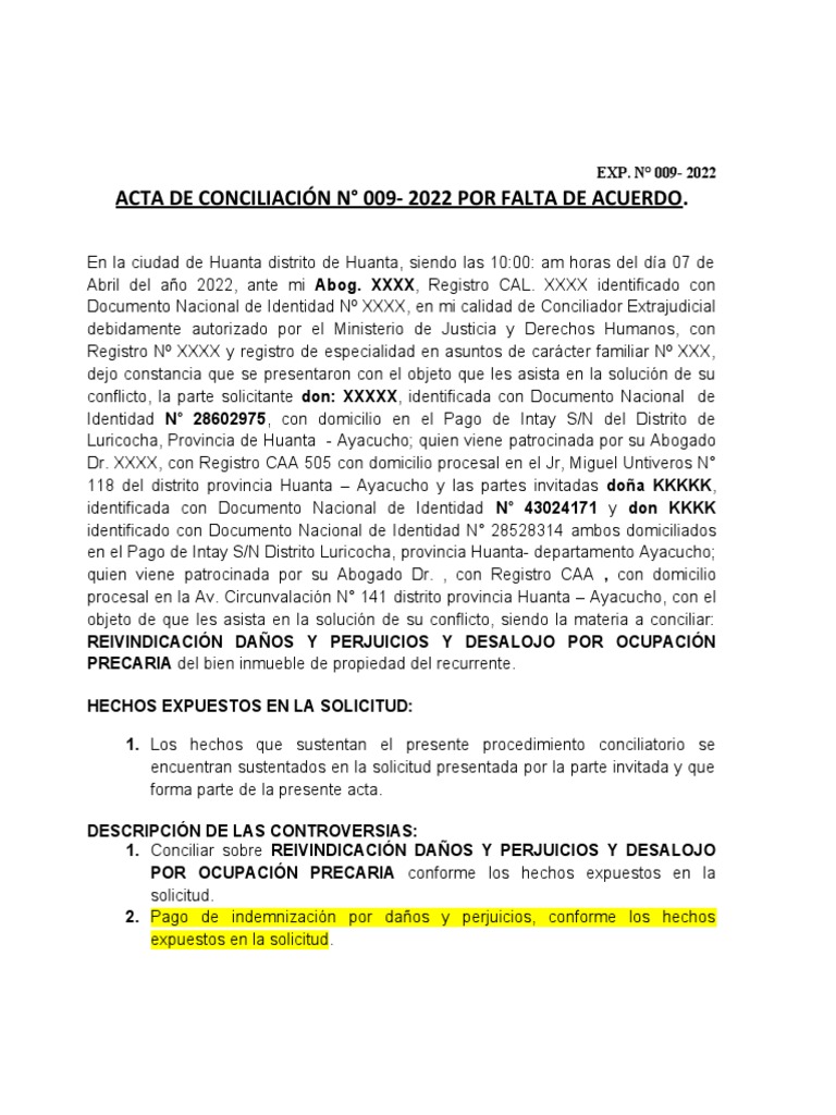 ACTA DE CONCILIACIÓN N° 009- 2022 POR FALTA DE ACUERDO.