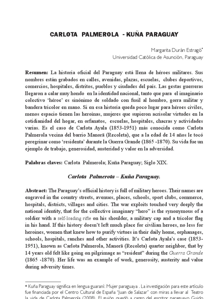 Abstract: The Paraguays official history is full of military heroes. Their names are engraved in the country streets, avenues, places, schools, sport clubs, commerce, hospitals, districts, villages and cities. The war exploits touched very deeply the national identity, that for the collective imaginary hero is the synonymous of a soldier with a self-loading rifle on his shoulder, a military cap and a tricolor flag in his hand. If this history doesnt left much place for civilian heroes, no less for heroines, women that knew how to purify virtues in their daily home, orphanages, schools, hospitals, ranches and other activities. Its Carlota Ayalas case (18531951), known as Carlota Palmerola, Manor (Recoleta) quarter neighbor, that by 14 years old felt like going on pilgrimage as resident during the Guerra Grande (1865 -1870). Her life was an example of work, generosity, austerity and value during adversity times.