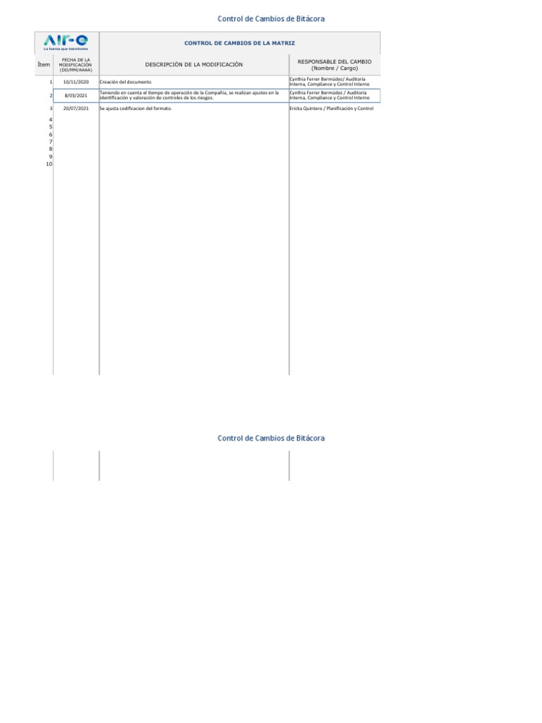 Control de Cambios en Matriz de Riesgos