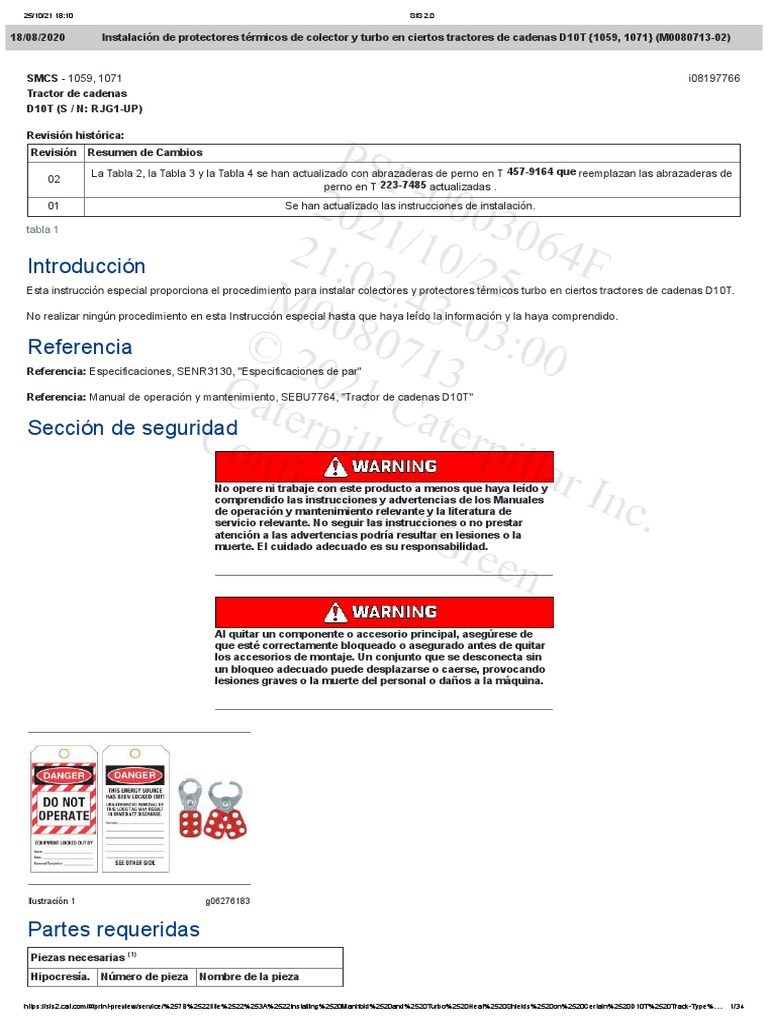 18/08/2020 Instalación de protectores térmicos de colector y turbo en ciertos tractores de cadenas D10T {1059, 1071} (M0080713-02)