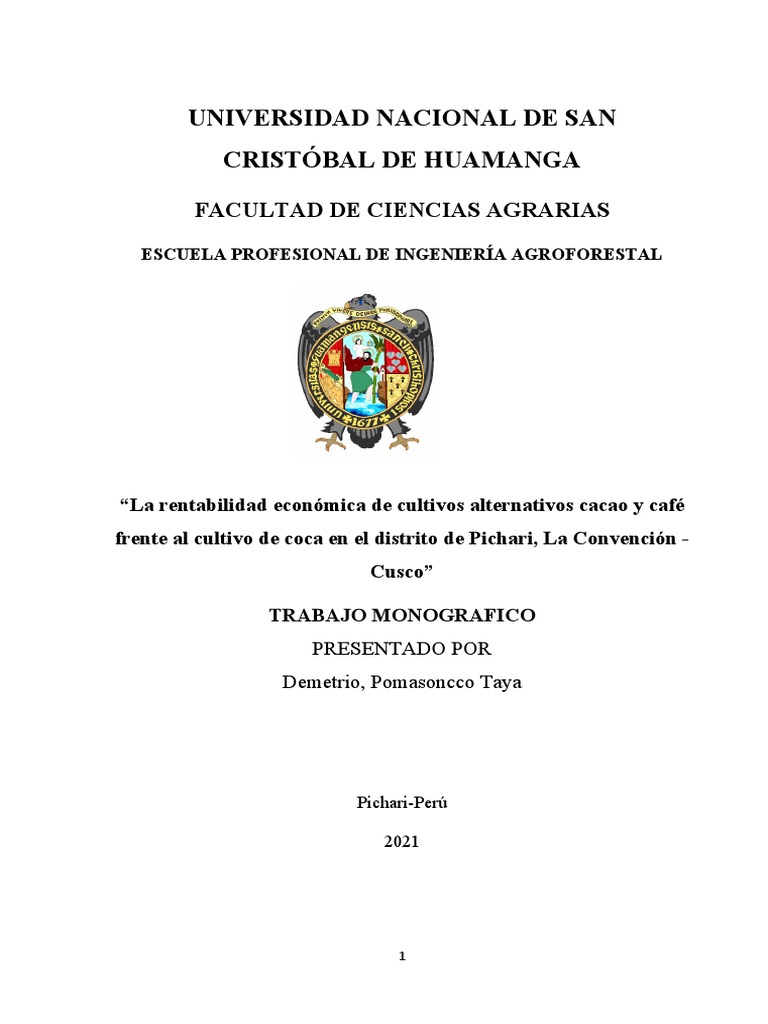 Conocer la rentabilidad económica de cultivos alternativos cacao y café frente al