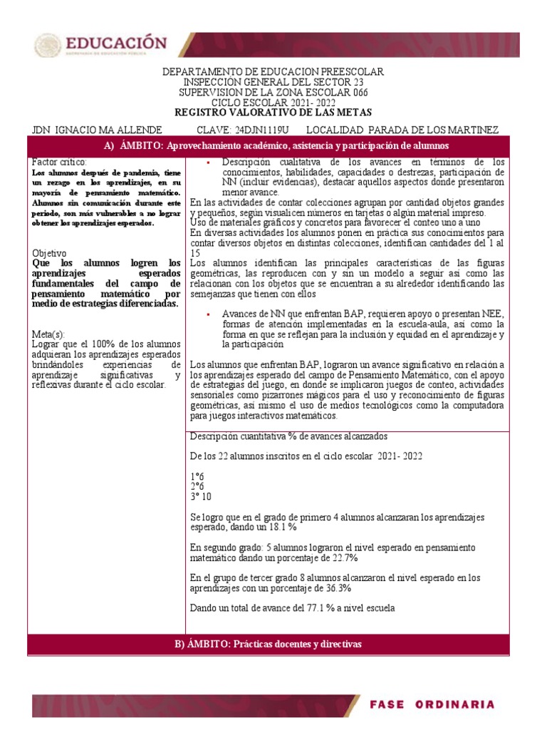 A) ÁMBITO: Aprovechamiento académico, asistencia y participación de alumnos