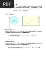 Un punto interior de un conjunto S es un punto para el que podemos encontrar un entorno o vecindad cuyos puntos pertenecen todos a S. Por ejemplo, el centro de un crculo. Un punto frontera de un conjunto S es un punto tal que todo entorno alrededor de l contiene puntos que pertenecen a S y que no pertenecen a S. Por ejemplo los puntos que forman la frontera de un crculo. Si un punto no es interior ni frontera de un conjunto de puntos S, entonces es un punto exterior a S. Entonces, si S es abierto no posee puntos frontera, solo puntos interiores. Si S es cerrado posee tambin a sus puntos frontera. Algunos conjuntos no son ni abiertos ni cerrados. Contienen algunos puntos frontera. Por ejemplo un entorno punteado. El plano complejo C es abierto y cerrado a la vez. No posee 14 puntos frontera.