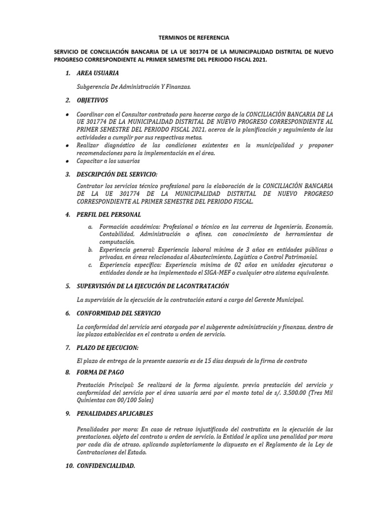 SERVICIO DE CONCILIACIÓN BANCARIA DE LA UE 301774 DE LA MUNICIPALIDAD DISTRITAL DE NUEVO