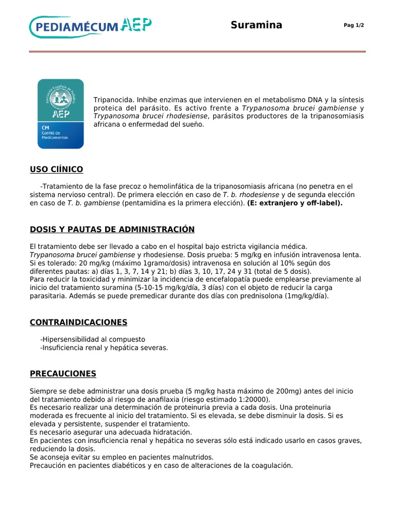 Trypanosoma brucei gambiense y rhodesiense. Dosis prueba: 5 mg/kg en infusión intravenosa lenta.