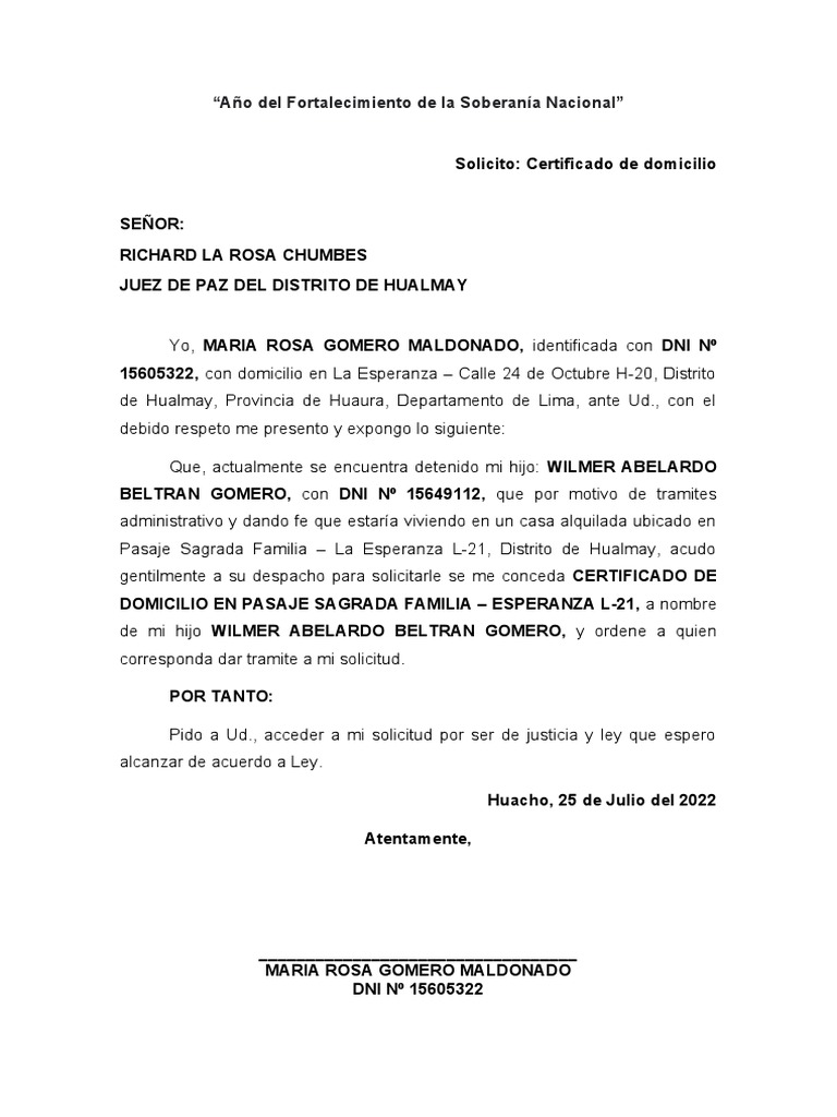 Solicito: Certificado de domicilio