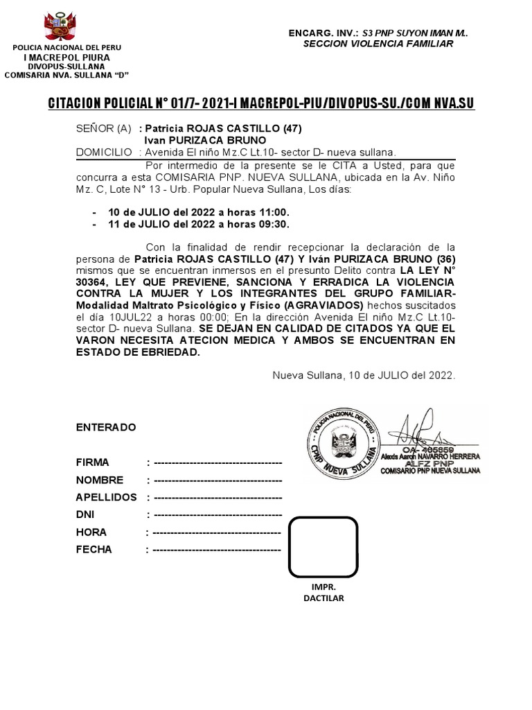 sector D- nueva Sullana. SE DEJAN EN CALIDAD DE CITADOS YA QUE EL