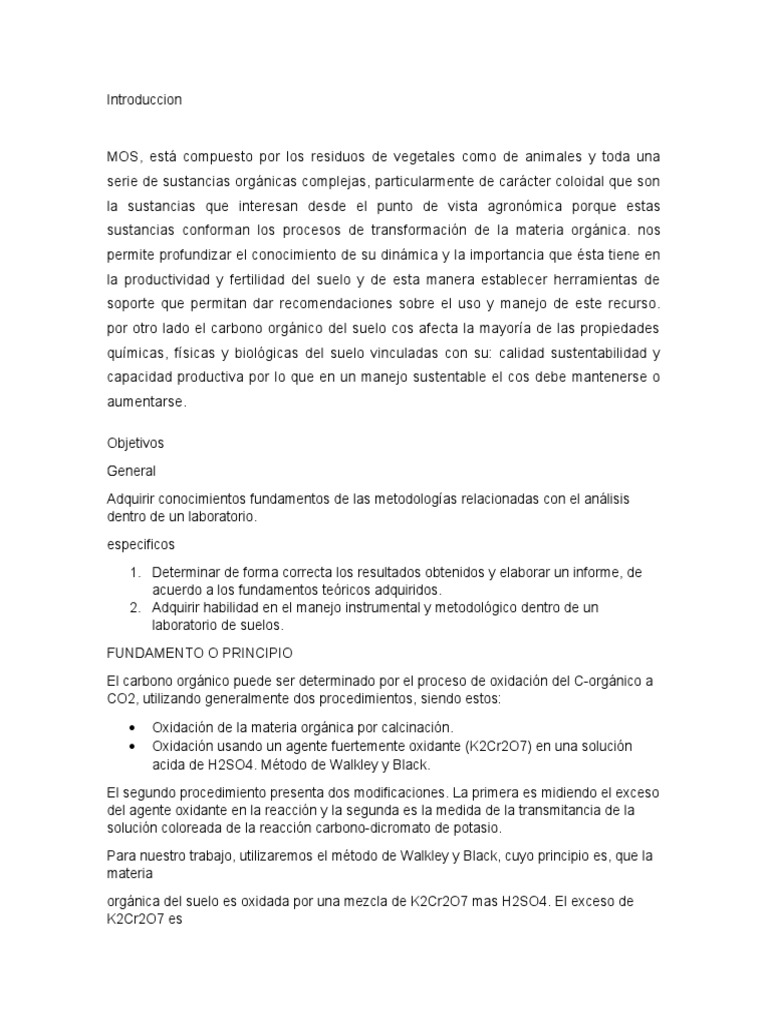 El carbono orgánico puede ser determinado por el proceso de oxidación del C-orgánico a