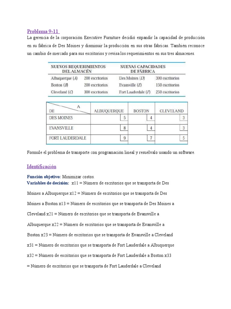 Variables de decisión: x11 = Número de escritorios que se transporta de Des