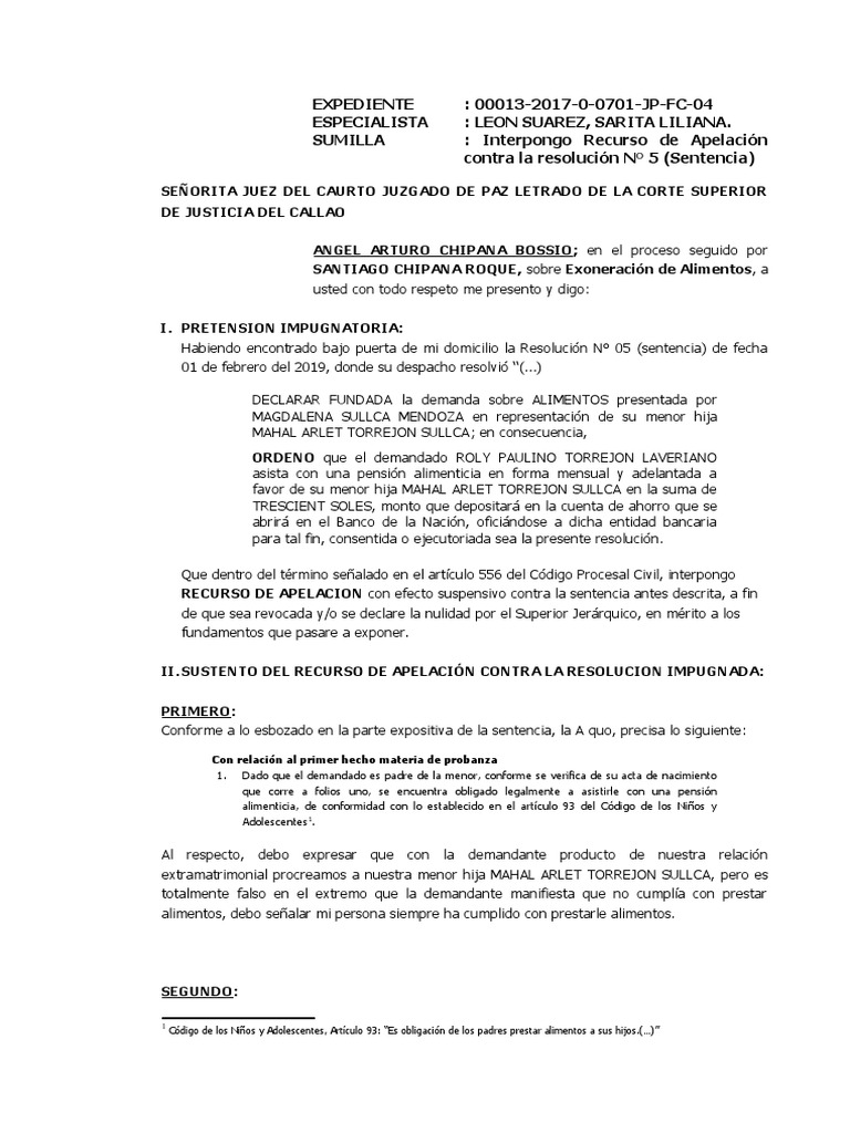 SANTIAGO CHIPANA ROQUE, sobre Exoneración de Alimentos, a