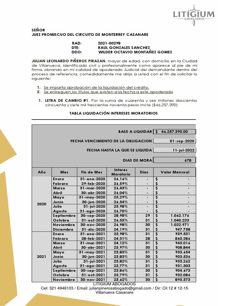 Cel: 321 4948103 / Email: julianpinerosabogado@[Link] / Dir: Cll 12 # 12-15