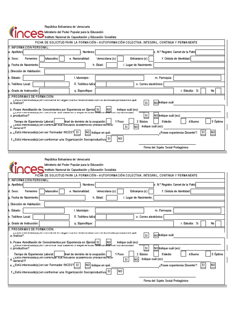 e. ¿Está interesado(a) en ser Formador INCES? SI NO Indique en qué: ¿Posee experiencia Docente?: SI NO