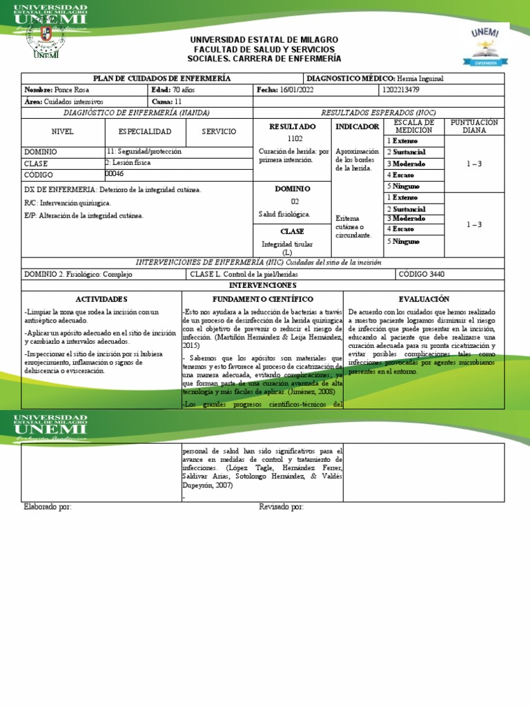 PLAN DE CUIDADOS DE ENFERMERÍA DIAGNOSTICO MÉDICO: Hernia Inguinal