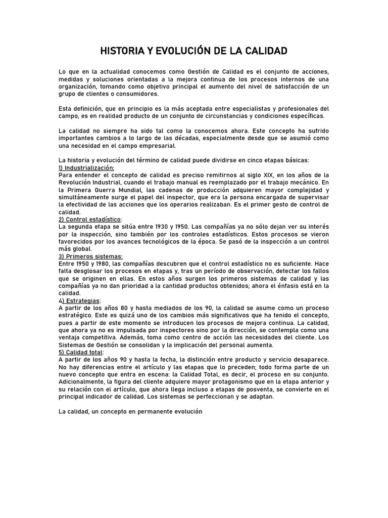 La historia y evolución del término de calidad puede dividirse en cinco etapas básicas: