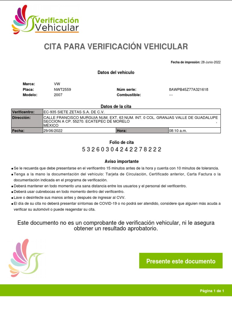 Este documento no es un comprobante de verificación vehicular, ni le asegura