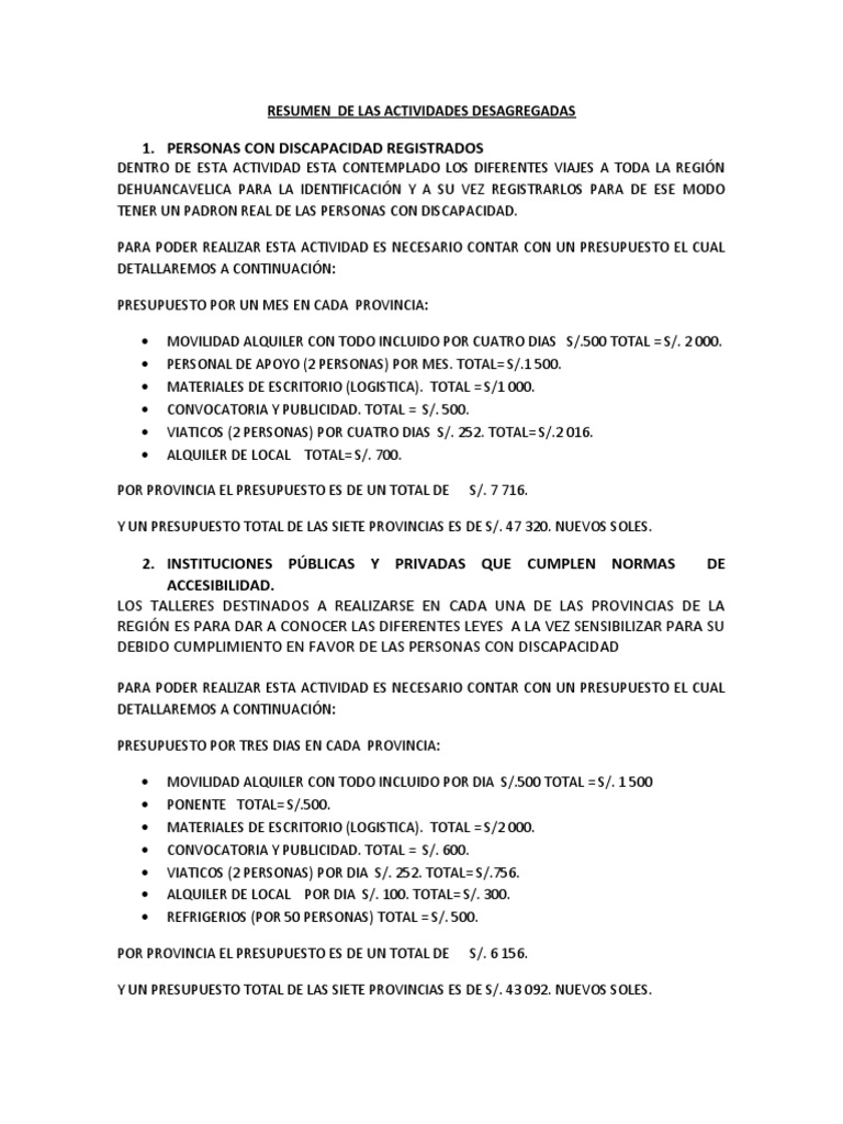 RESUMEN DE LAS ACTIVIDADES DESAGREGADAS