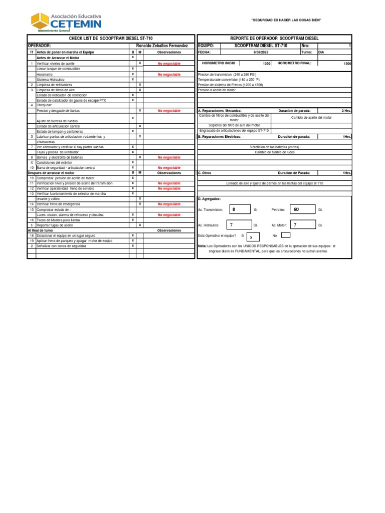 CHECK LIST DE SCOOPTRAM DIESEL ST-710 REPORTE DE OPERADOR SCOOPTRAM DIESEL