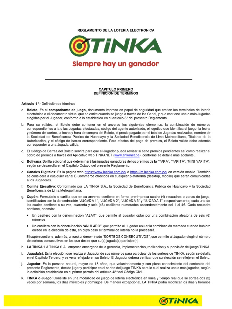 1.3.4 Cualquier especificación adicional que LA TINKA defina para cada periodo de vigencia de la modalidad de juego