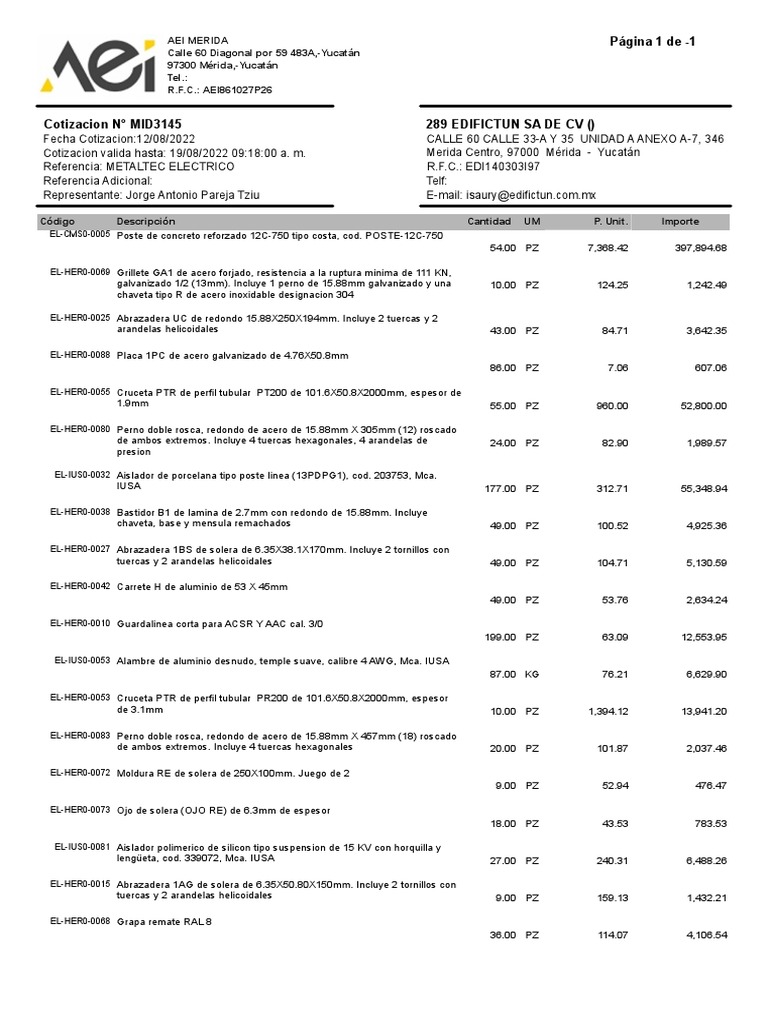 Cotizacion N° MID3145 289 EDIFICTUN SA DE CV ()