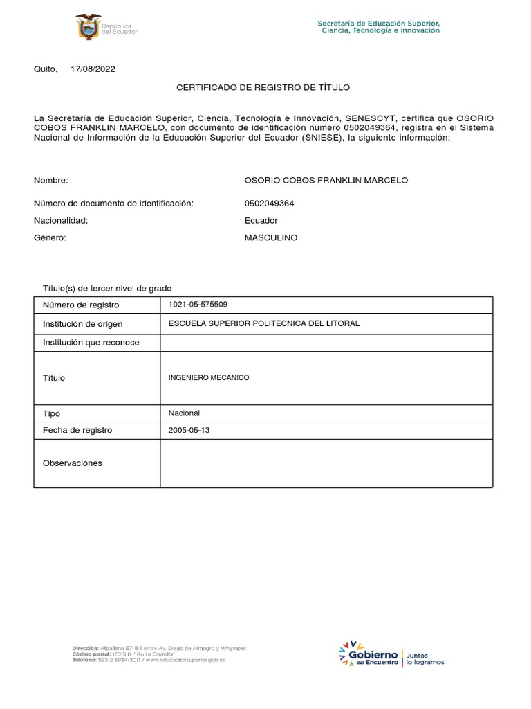 La Secretaría de Educación Superior, Ciencia, Tecnología e Innovación, SENESCYT, certifica que OSORIO