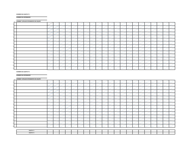 El documento presenta la lista de dos equipos con sus respectivos entrenadores y 15 integrantes cada uno, sin especificar los nombres de los jugadores.