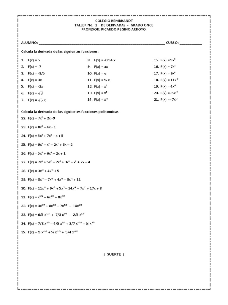 TALLER No. 1 DE DERIVADAS - GRADO ONCE