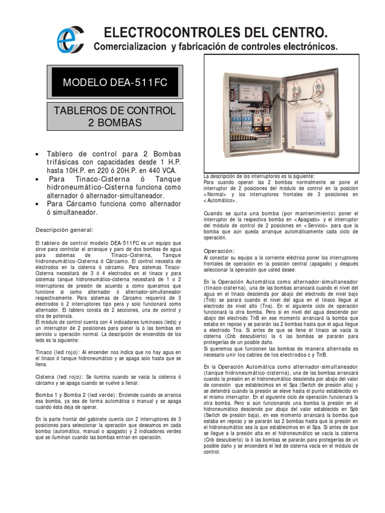 El tablero de control modelo DEA-511FC es un equipo que sirve para controlar el arranque y paro de dos bombas de agua para sistemas de Tinaco-Cisterna, Tanque hidroneumtico-Cisterna Crcamo. El control necesita de electrodos en la cisterna crcamo. Para sistemas TinacoCisterna necesitar de 3 4 electrodos en el tinaco y para sistemas tanque hidroneumtico-cisterna necesitar de 1 o 2 interruptores de presin de acuerdo a como queramos que funcione si como alternador alternador-simultaneador respectivamente. Para sistemas de Crcamo requerir de 3 electrodos 2 interruptores tipo pera y solo funcionar como alternador. El tablero consta de 2 secciones, una de control y otra de potencia. El mdulo de control cuenta con 4 indicadores luminosos (leds) y un interruptor de 2 posiciones para poner la las bombas en servicio u operacin normal. La descripcin de encendido de los leds es la siguiente: Tinaco (led rojo): Al encender nos indica que no hay agua en el tinaco tanque hidroneumtico y se apaga solo hasta que se llena. Cistena (led rojo): Se ilumina cuando se vaca la cisterna crcamo y se apaga cuando se vuelve a llenar. Bomba 1 y Bomba 2 (led verde): Enciende cuando se arranca esa bomba, ya sea de forma automtica o manual y se apaga cuando sta deja de operar. En la parte frontal del gabinete cuenta con 2 interruptores de 3 posiciones para seleccionar la operacin que deseamos en cada bomba (automtico, manual o apagado) y 2 indicadores verdes que se iluminan cuando las bombas entran en operacin.