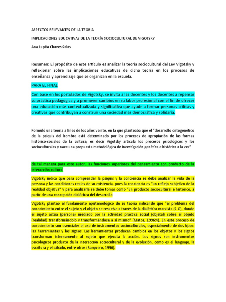 Resumen: El propósito de este artículo es analizar la teoría sociocultural del Lev Vigotsky y