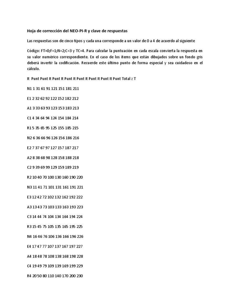 Hoja de corrección del NEO-PI-R y clave de respuestas