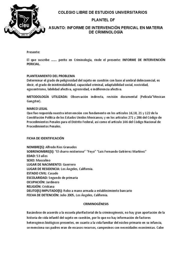 El que suscribe ……. perito en Criminología, rinde el presente: INFORME DE INTERVENCIÓN