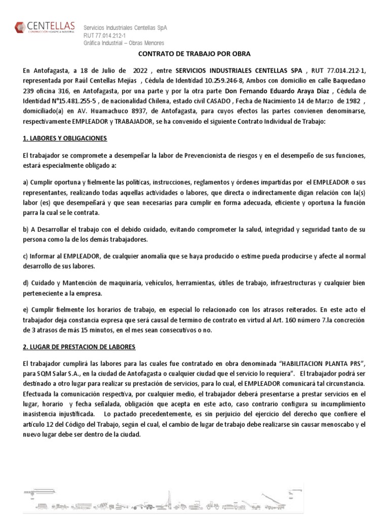 En Antofagasta, a 18 de Julio de 2022 , entre SERVICIOS INDUSTRIALES CENTELLAS SPA , RUT 77.014.212-1,
