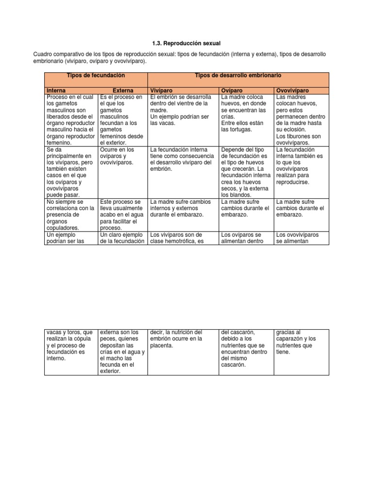 Cuadro comparativo de los tipos de reproducción sexual: tipos de fecundación (interna y externa), tipos de desarrollo
