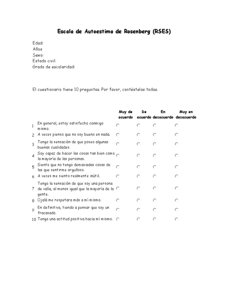 Muy de acuerdo 1 En general, estoy satisfecho conmigo mismo. Tengo la sensacin de que poseo algunas buenas cualidades. Soy capaz de hacer las cosas tan bien como la mayora de las personas. Siento que no tengo demasiadas cosas de las que sentirme orgulloso.