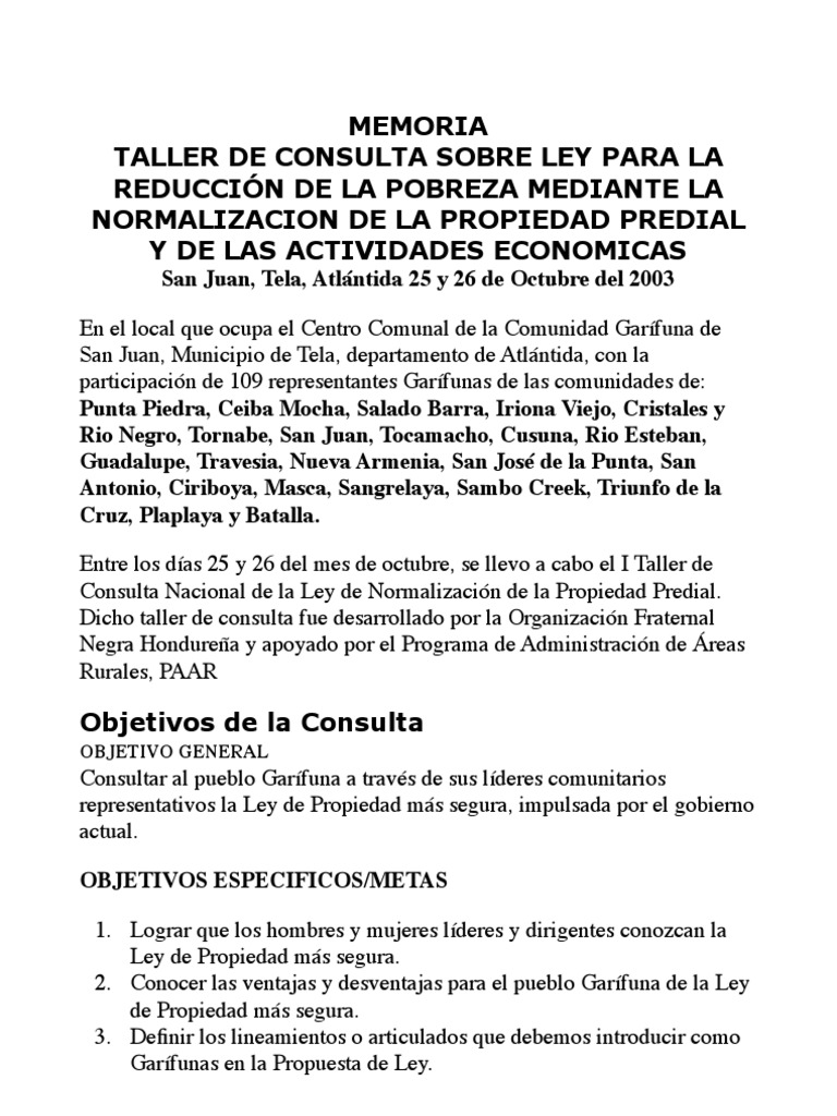 San Juan, Tela, Atlntida 25 y 26 de Octubre del 2003 En el local que ocupa el Centro Comunal de la Comunidad Garfuna de San Juan, Municipio de Tela, departamento de Atlntida, con la participacin de 109 representantes Garfunas de las comunidades de: Punta Piedra, Ceiba Mocha, Salado Barra, Iriona Viejo, Cristales y Rio Negro, Tornabe, San Juan, Tocamacho, Cusuna, Rio Esteban, Guadalupe, Travesia, Nueva Armenia, San Jos de la Punta, San Antonio, Ciriboya, Masca, Sangrelaya, Sambo Creek, Triunfo de la Cruz, Plaplaya y Batalla. Entre los das 25 y 26 del mes de octubre, se llevo a cabo el I Taller de Consulta Nacional de la Ley de Normalizacin de la Propiedad Predial. Dicho taller de consulta fue desarrollado por la Organizacin Fraternal Negra Hondurea y apoyado por el Programa de Administracin de reas Rurales, PAAR