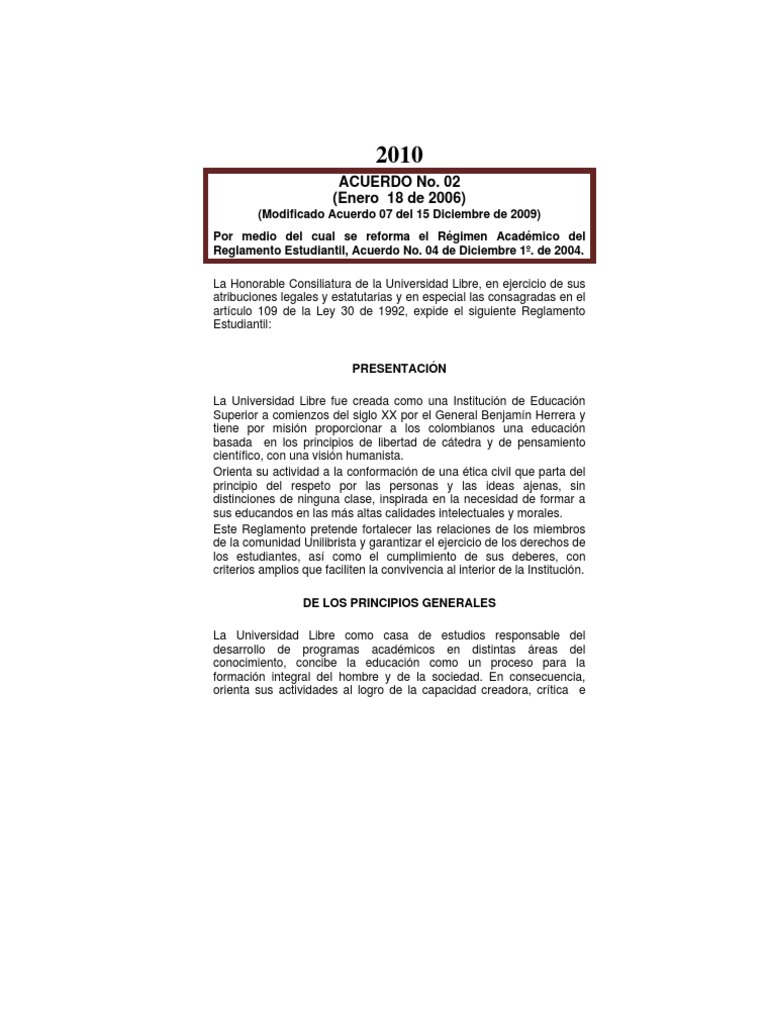 PRESENTACIN La Universidad Libre fue creada como una Institucin de Educacin Superior a comienzos del siglo XX por el General Benjamn Herrera y tiene por misin proporcionar a los colombianos una educacin basada en los principios de libertad de ctedra y de pensamiento cientfico, con una visin humanista. Orienta su actividad a la conformacin de una tica civil que parta del principio del respeto por las personas y las ideas ajenas, sin distinciones de ninguna clase, inspirada en la necesidad de formar a sus educandos en las ms altas calidades intelectuales y morales. Este Reglamento pretende fortalecer las relaciones de los miembros de la comunidad Unilibrista y garantizar el ejercicio de los derechos de los estudiantes, as como el cumplimiento de sus deberes, con criterios amplios que faciliten la convivencia al interior de la Institucin. DE LOS PRINCIPIOS GENERALES La Universidad Libre como casa de estudios responsable del desarrollo de programas acadmicos en distintas reas del conocimiento, concibe la educacin como un proceso para la formacin integral del hombre y de la sociedad. En consecuencia, orienta sus actividades al logro de la capacidad creadora, crtica e