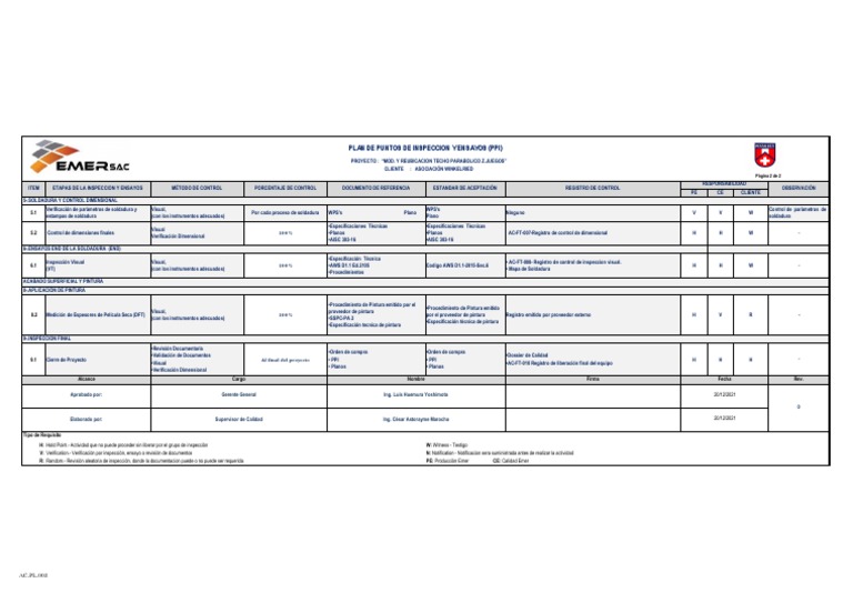 V: Verification.- Verificación por inspección, ensayo o revisión de documentos N: Notification - Notificacion sera suministrada antes de realizar la actividad