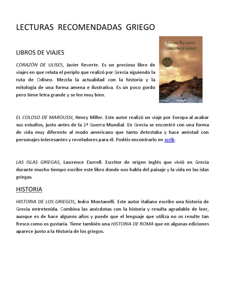 CORAZN DE ULISES, Javier Reverte. Es un precioso libro de viajes en que relata el periplo que realiz por Grecia siguiendo la ruta de Odiseo. Mezcla la actualidad con la historia y la mitologa de una forma amena e ilustrativa. Es un poco gordo pero tiene letra grande y se lee muy bien.